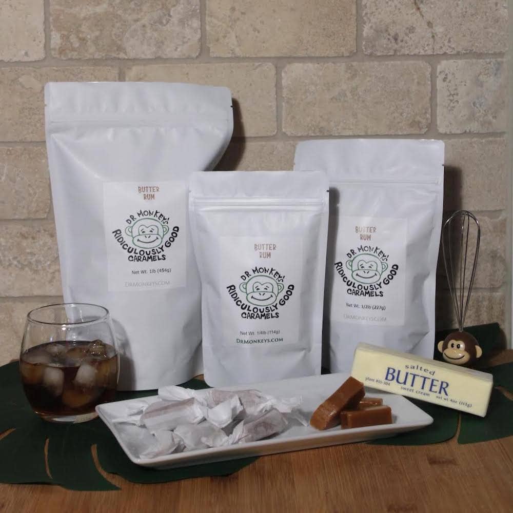 Dr. Monkey's Butter Rum caramel is nostalgic flavor reminiscent of an old-fashioned butter rum lifesaver. Old-fashioned, small batch, artisan caramels the way they were meant to be. No preservatives and gluten-free. Just pure goodness in every bite. Share them with a friend or keep them all for yourself.