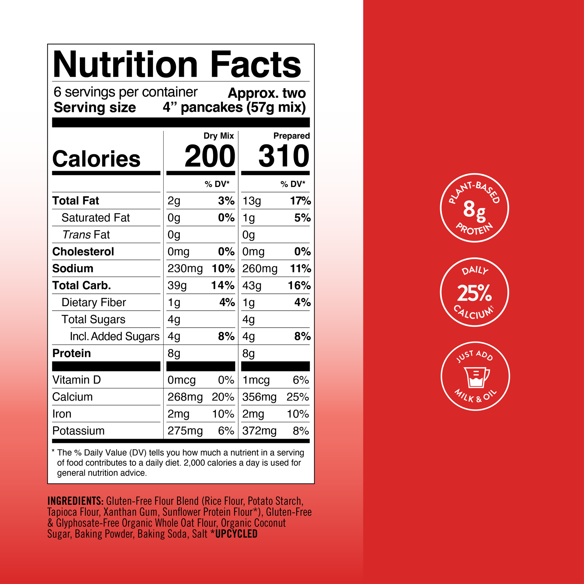 Power up your mornings with an incredibly yummy breakfast that’s easy to make and even easier to enjoy. This versatile, protein-packed mix with a whopping 8 grams of protein is made with Top 9 allergen-free ingredients and upcycled sunflower protein flour for naturally sweet, fluffy pancakes or crisp waffles. Fuel yourself and the planet! MIX MAGIC: * VEGAN & GLUTEN-FREE * FREE OF TOP 9 ALLERGENS (WHEAT, DAIRY, EGGS, TREE NUTS, PEANUTS, SOY, SESAME, SHELLFISH, CRUSTACEAN FISH) * MADE WITH UPCYCLED SUNFLOWER PROTEIN FLOUR * 8g PLANT-BASED PROTEIN * 25% CALCIUM * 0g REFINED SUGAR * JUST ADD OIL & PLANT MILK Key Ingredients Organic Whole Oat Flour: Gluten-Free, Glyphosate-Free, and NON-GMO, it is packed with protein, fiber, and iron Upcycled Sunflower Protein Flour: Made from the nutritious pulp leftover from sunflower oil production, it is high in protein, fiber, and potassium Potato Starch: Great source of resistant starch.